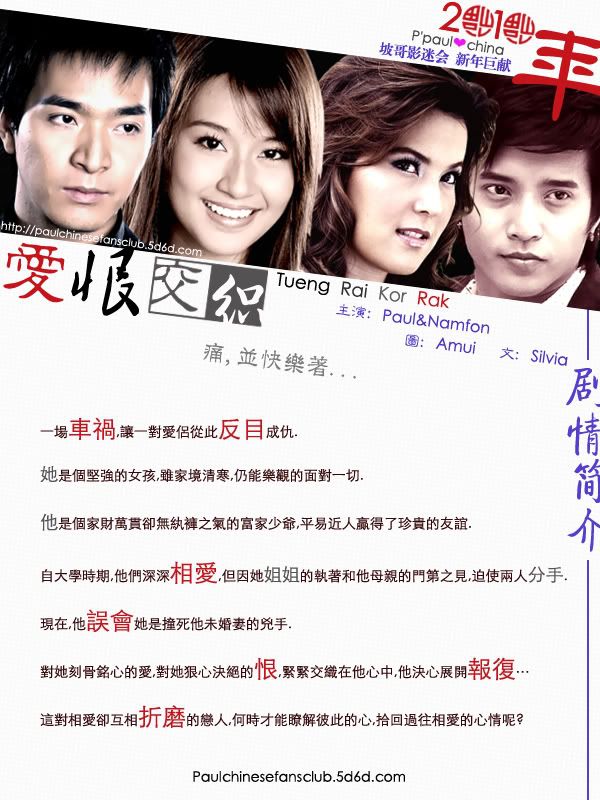 【剧 名】:爱恨交织 【集 数】:12集 【首 播】:2008年7月30日 【格 式】:RMVB 【语 言】:泰语 【字 幕】:中字 【导 演】:Worawit Sreesuparb 【主要演员】: Pattarapol Silapajarn(Paul ) .... Win Namfon Patcharin .... Na Tanyares Ramnarong (Tanya) .... Nee Kiatkamol Lata (Tui AF3) ....Dong 【制作出品】:坡哥影迷会 【内容简介】: Win和Dong是大学同学,在第一次到校报到时.他们同时被Na的美貌所吸引...通过大学的相处Win向Na告白,Na也接受了Win...但由于Win的身份地位高,他的母亲就找了Na谈话.叫Na和Win分手,当Na向他提出分手后,Win很是伤心...在种种原因下,Win就被迫和别的女人的订了婚..但他还是深深地爱着Na.....后来WIn的未婚妻出车祸死了,他以为是Na撞死了她,就开始欺负.折磨Na...一次次的伤害她(这部分坡哥虐得太狠了点,我本人不喜欢).....   Na是一个孤儿,她是个漂亮善良的女孩....她和她的婶婶及姐姐Nee住在一起.她很满足她的生活,她生活得很快乐....她很爱她的姐姐,她能为她的姐姐牺牲自己的所有,甚至的爱的人Win....因为她的姐姐曾经救过她,使她脱离了危险,,,然而她的姐姐就受过伤害...这是Na的心病,她觉得什么事都必须服从她.让着她...   Dong生活在一破碎的家庭里,他的父亲抛下了他的母亲和他离家出走....他和他那每天喝酒的母亲相依为命.他和Win同时喜欢着Na,但他却不敢告白..因为他觉得自己比不上Win,他嫉妒Win什么都比他好...当Na哭着来找他倾诉Win的母亲叫她和Win分手时,他安慰Na,不料被Win发现,Win以为Na和他分手是因为Dong,情急之下也就答应了那场婚约....Dong看到Win订婚时,心里也是暗暗欣喜...同时他也鼓起了勇气向Na告白...Na为了忘记Win就答应了他......   Nee是Na的姐姐.还是在学生时期,在回家的路上,被流氓拦劫时,Nee勇敢地站出来救Na,可是姐姐却被抓住,后来就被那些流氓给轮奸了...这使得Nee心里上受到了很大的打击...而Na也就是因为这件事而一直服从着Nee...甚至是Win她也让给她...Nee和Win是在一次事故中相识,他救了被流氓欺负的她..Nee对他是一见钟情,可没想到的是他喜欢的这个男人居然是妹妹的男朋友,于是她就要Na让给她....Na忍受着Win妈妈和Nee的双重压力,就被迫分手,把Win让给她的姐姐....致使后来Na也流产了....   后来的那场车祸其实是她姐姐造成的,她当时撞死了Win的未婚妻由于害怕就逃走了...这是Win正好赶到,看见满身是血的未婚妻躺在Na的怀里....就以为是Na给撞的...然而Na为了帮她的姐姐就隐瞒了这件事的真相...就这样深深地误会开始了... 【共享时间】:基本24小时在线 【说明】:此片为学习泰语的朋友之用,如果喜欢本片,请购买正版 买鞋子哪个网站好?首选中国最大的正品鞋网商城(http://shoes.weixiaodian.com/)、 网上正品鞋城(http://u.weixiaodian.com/shoe/)。微店网页版请从http://121.weixiaodian.com登录:手把手教你如何免费申请开通微店、怎样经营微店及如何用微店赚钱。看笑话,上