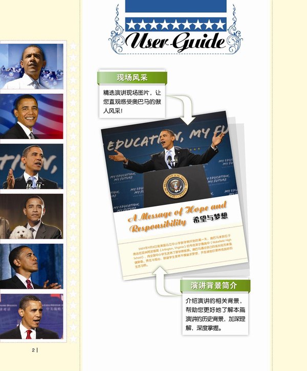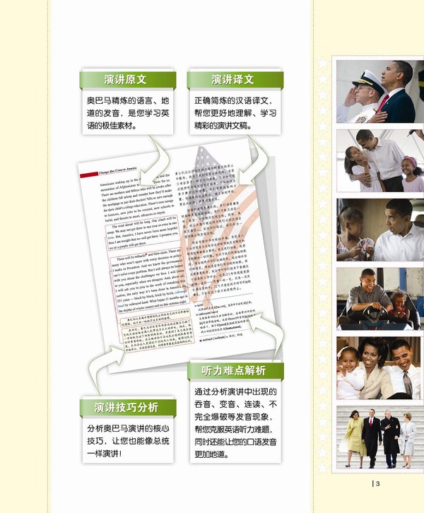 5. 演讲材料新。本书收录了奥巴马最新、最近的重要演讲。让您的学习能跟上实事动态的发展!