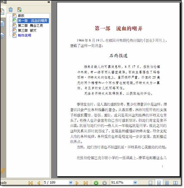 在美国新英格兰地区的一个小镇上,十七岁的高中女生凯丽过着悲惨的生活。在学校,她受尽同学的欺辱,在家则生活在宗教狂母亲的阴影中。她不知自己拥有一种神奇的力量„„在毕业舞会上,这力量爆发了,倾刻间将学校、甚至小镇化为灰烬„„   美国恐怖小说大师斯蒂芬·金的这部作品将让你毛骨悚然。   第一部   流血的嘲弄   1966年8月19日,在缅因州韦斯托弗出版的《创业》周刊上,登载了这样一则消息:   石雨报道据来自数人的可靠消息称,8月17日,在张伯伦镇卡林街,有一场石雨从碧空突降。石块主要落在了玛格丽特·怀特太太的住宅上,屋顶损坏严重,价值约25美元的两个檐槽和一个雨水管也被砸毁。怀特太太为一寡妇,与三岁的女儿凯丽塔同住。   无法与怀特太太取得联系,以获取她的评论。   事情发生时,没人真的感到惊奇,至少在潜意识中是这样,潜意识只会产生各种残暴的意念。从表面看,淋浴间里所有的女孩子都感到震惊、恐惧、羞耻,或只是高兴这狗娘养的怀特又吃苦头了。有些人也许会宣称自己当时感到惊讶,但她们肯定是言不由衷。凯丽与她们中的一些人从一年级起就是同学,彼此之间的这种关系从那时就形成了,发展虽然缓慢却始终未变,符合支配人性的各种规律,各种反应也都是稳定地一步步发展,直到接近临界点。   当然,她们当时谁也不知道凯丽·怀特具有心灵致动的功能。   在张伯伦镇巴克尔街小学的一张课桌上,潦草地刻着这么几...   观者 OCR、一校   2010 年 5月 9 日星期日   09:53:32   观者邮箱:ljctt@263.net   观者博客:http://blog.sina.com.cn/seeseasee   观者 QQ:1139496397