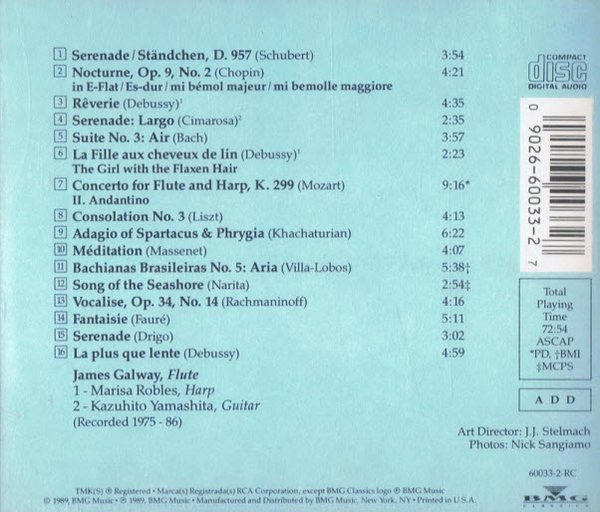 Serenade is a collection of slower, romantic classical pieces with the flute of James Galway joined by a variety of orchestras. ~ MusD