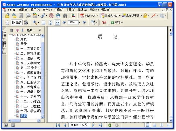 : 一、不可思议的魔术(艺术魅力与文艺鉴赏) 二、笔补造化天无功(教育、认识作用与社会效益) 三、思接千载,视通万里(想象与再创造) 四、文字觑天巧(语言析赏和文艺信息) 五、不是情人不泪流(入境与动情、移情与心理距离) 六、倾国宜通体(整体性与画眼睛) 七、真作假时假亦真(肖形与传神、真实与虚构) 八、红尘多少奇杰(人物、形象、典型) 九、丹青难写是精神(心理、意境、意识流) 十、巧啭岂能无本意(语言艺术与对话描写) 十一、更别有系人心处(动作情态描写) 十二、于细微处见精神(细节与空白) 十三、山在虚无缥缈间(含蓄美和朦胧美) 十四、欲说还休(矛盾美与包孕的顷刻) 后记