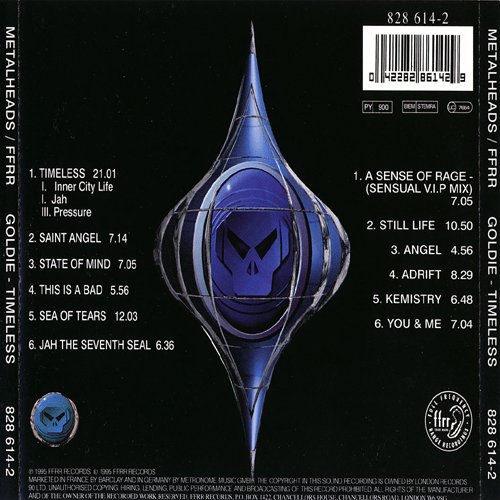 goldie的事业像是黑暗到光明。最早的单曲“terminator”(终结者)充斥着不协调的工业噪音;1993年的“angel”(天使)开始有人声的介入;而“timeless”则是两者的混合。尤其是其中的“sea of tears”(泪之海),既有人造的声音,又可以听到吉他、贝司、鲸鱼的歌唱和女孩的低声呜咽。goldie说:“也许它听起来很不错,但总有些黑暗的角落。这只是种心情,不是吗?我的成长并不令人愉快,每个人都有一个自己的角落,‘sea of tears'就是我的。”