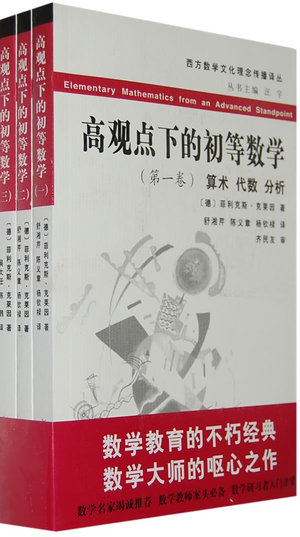 《高观点下的初等数学》一书,至今读来仍然感到十分亲切。这是因为,其内容主要是基础数学,其观点蕴含着真理,而当时德国数学教育中的不少问题,在今日之我国也仍然存在。克莱因声称本书是为中学教师和成熟的大学生写的,但按其内容,所有对数学有一定了解的人都可以从中获得教益和启发……现代数学已发生了极大变化,新成果、新概念、新观点、新学科层出不穷。我热切希望我国高水平的数学多面手会写出更结合我国实际的、现代化的《高观点下的初等数学》。这样一本书的出版将是我国数学教育史上的一件大事。