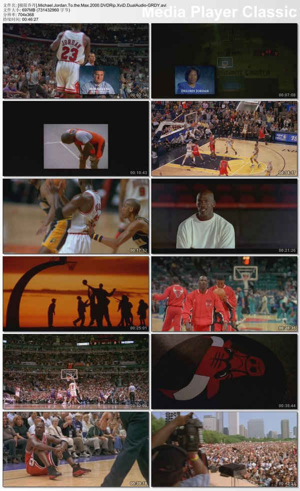 影片讲述的是乔丹在1998 年季后赛的传奇故事。许多传播中看不到的场边境头,展现了乔丹的不同侧面,而经过精心处理的声效以及电脑特技的运用使影片更像好莱坞大片。如果你是篮球迷、乔丹迷,而你却还没有看过这部影片,那么这将成为你终身的遗憾,本片将把你带回98年NBA PLAYOFFS,重温乔丹与公牛最辉煌的时刻。 代码 .=*=*=*=*=*=*=*=*=*=*=*=*Shared By WayneGerrardy@BYRBT*=*=*=*=*=*=*=*=*=*=*=*=. * * | | * General Information * | Name............: Michael.Jordan.To.the.Max.2000.DVDRip.XviD.DualAudio | * Runtime.........: 46 min * | Size............: 1CD 49x15MiB | * Video Codec.....: XviD * | Frame Rate......: 23.976 fps | * Bit Rate........: Variable @ 1,895 Kbps * | Resolution......: 704 x 368 | * Aspect Ratio....: 1.92 : 1 * | Scan Type.......: Progressive | * Audio...........: English MPEG-1 Layer 3 @ 96 Kbps * | Suntitles.......: CHS/ENG | * Source..........: DVD 5 * | IMDb Rating.....: 7.2/10 733 votes | * IMDb Link.......: http://www.imdb.com/title/tt0245280/ * | | * * | Post Information | * Encoder.........: GRDY * | Release Date....: 03/25/2003 | * * | | * Plot * | When the film starts showing a few highlights of Game 3 of the NBA | * Finals, one of the clips is of Michael Jordan doing a side-to-side (right * | side of the hoop to the left side of it) reverse move and scoring. This | * is a move that he did in Game 2 of the 1997 NBA Finals, more than a year * | earlier.Although the Bulls are playing the Utah Jazz in the same instance,| * this documentary is supposed to be based on the 1998 season. * | | * * `=*=*=* Welcome to our IPv6 Private Tracker site - http://bt.byr.edu.cn *=*=*='