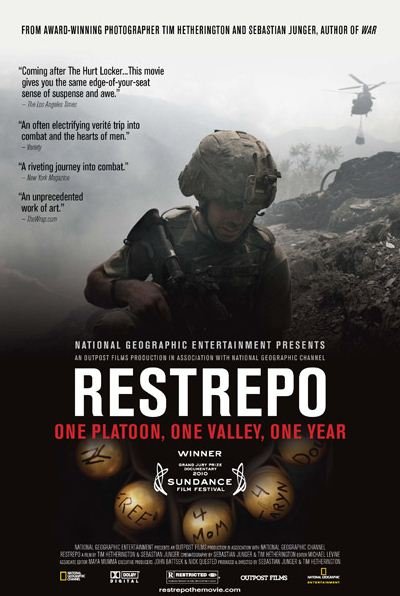 Winner of the 2010 Sundance Film Festival Grand Jury Prize for a Documentary, RESTREPO chronicles the deployment of a U.S. platoon of courageous American soldiers in Afghanistan's Korengal Valley, considered to be one of the most dangerous postings in the U.S. military. From May 2007 to July 2008, Tim Hetherington and Sebastian Junger dug in with the men of the Second Platoon, Battle Company of the 503rd Infantry Regiment (airborne), stationed at Restrepo, sharing duties and shooting more than 150 hours of combat, frustration, routine, jokes, terror and bravery during daily life at the outpost. Hetherington and Junger, have made a film unlike any other about men in harm’s way. We see their courage. We experience their frustrations. We share their bonding. We hear the music they listen to, and we see the snapshots of their kids that they pass around. It is something that audiences have never before experienced. As they fight the Taliban, these 15 men win our hearts and minds in a way no fictional film can.