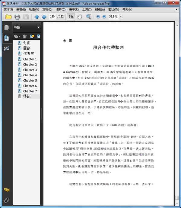 : 作者序 讨债公司的SIR谈判术 Chapter 1 什么是SIR谈判法则? 谈判成败,始终取决於人性 二十年实战让我发现[SIR法则] SIR的第一层意义-以对手为师 SIR的第二层意义-讯息选择权 SIR兩层意义的交互使用 Chapter 2 SIR运用在B2C的谈判 直销人员 客服人员 店头销售人员 仲介人员 消费纠纷谈判 Chapter 3 SIR运用在B2B的谈判 业务部门 公关部门 危机处理部门 商业谈判及纠纷排解 Chapter 4 SIR的短线攻击法--攻死穴 短线客户的要求不是要求 短线客户的死穴只能攻一次 三秒内就做好讯息选择的战术 Chapter 5 SIR的长线佈局法--吊胃口 让对方永远感受到被尊重 把「敬意」分期付出 让对方知道自己的好处有多少? 选择一个真讯息,预告九个假讯息 Chapter 6 SIR的海棉战术 如何运用SIR化解谈判僵局 如何运用SIR化解谈判衝突 Chapter 7 SIR的让步策略--归零的智慧 归零不是回到原点 用最小成本最高效益让步 以退为进的攻击力更强大 后记 用合作代替谈判