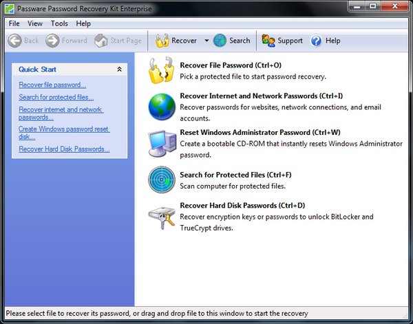 一个号称可以破解所有文件密码的工具,支持 Excel、Access、Outlook、Word、WinZip、WinRAR、Windows NT、 Windows 2000、Windows XP、Windows 2003、Windows Vista、Windows 7、Acrobat WordPerfect、Lotus Notes、Quicken QuickBooks、Quattro Pro、 Internet Explorer、Outlook Express、ACT、1-2-3、Paradox 等180多种类型的密码恢复,新版本除加强了对 Windows XP/2000/NT、QuickBooks和Internet Explorer 密码的恢复功能外,还加强了对 MSN Messenger、Google Talk Messenger、Yahoo Messenger 的支持,对微软最新的操作系统 Vista/7 和 Office 2007/2010 也有很好的支持,尤其是在 Windows Key 恢复模块上体现更为明显,以前使用 Windows Key 创建系统重置光盘映像后,还需要使用第三方刻录软件进行刻录,现在无需使用第三方刻录软件即可完成映像的刻录,为你免去了不少的麻烦,真正实现了映像创建、刻录的一体化。总之,它是一款不可多得的密码恢复工具集合。如果你在使用软件过程中需要更多的帮助,请参阅其帮助文件。