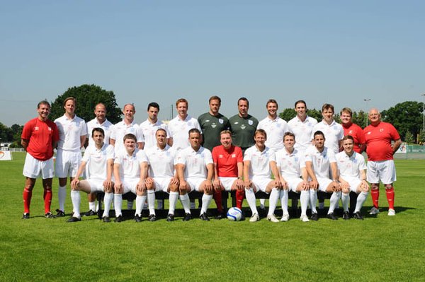 Back Row: Bryan Robson, Rupert Penry-Jones, Alan Shearer, Nicky Butt, Dominic Cooper, Damien Lewis, Jamie Theakston, David Seaman, Jonathan Wilkes, Martin Keown, Ben Shephard, James Corden, Clive Tyrrell