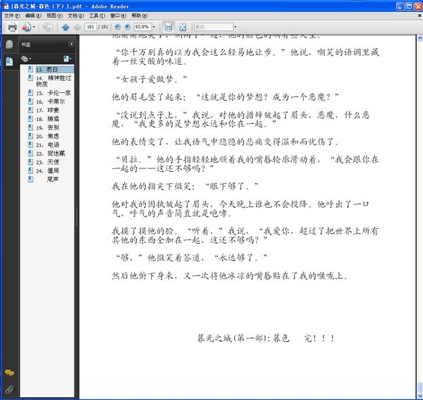: 暮光之城-暮色(上) 序暮 1.初见 2.打开的书 3.奇迹 4.邀请 5.晕血 6.恐怖故事 7.噩梦 8.惊魂 9.推测 10.问答 11.纠葛 12.平衡 暮光之城-暮色(下) 13.表白 14.精神胜过物质 15.卡伦一家 16.卡莱尔 17.球赛 18.捕猎 19.告别 20.焦虑 21.电话 22.捉迷藏 23.天使 24.僵局 尾声