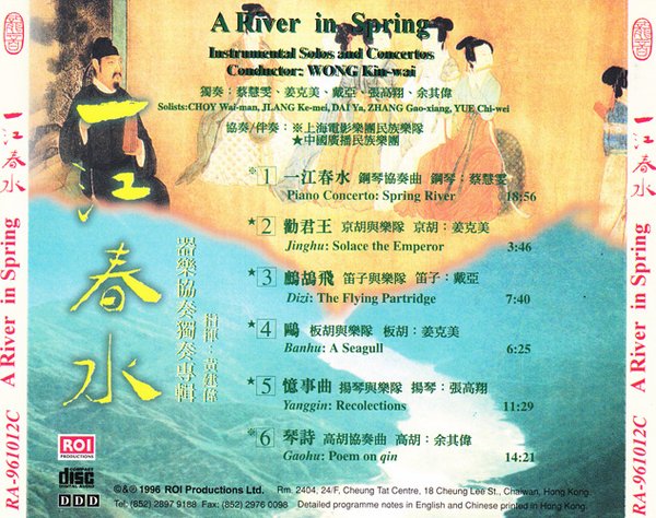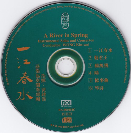 一江春水-器乐协奏独奏专辑 本辑收录了六首由黄建伟执棒指挥不同风格、不同乐器演奏的器乐协奏、独奏曲,由上海电影乐团民族乐队及中国广播民族乐团协奏及伴奏。 其中包括了钢琴协奏曲《一江春水》,由蔡慧雯独奏。京胡与乐队《欢君王》和板胡与乐队《鸥》的独奏者姜克美、笛子与乐队《鹧鸪飞》演奏者戴亚、扬琴与乐队的独奏人是张高翔、高胡协奏曲《琴诗》是余其伟独奏。共六项作品,由澳门中乐团的音乐总监兼指挥黄伟建指挥乐队伴奏。较为突出的《一江春水》是徐景新所作。乐曲着力地表现南唐后主李煜所作《虞美人·春花秋月何时了》诗词中的意境,第一乐章名“春花秋月”,第二乐章“不堪回首”,第三乐章“一江春水”。乐曲的意境描写得很透彻,而蔡慧雯的演奏也是非常适当,充满了深刻的音乐感。《鹧鸪飞》是民间乐曲,由赵松庭加工和改编,很多演奏家都会选奏此曲,相信是因为乐曲的旋律流畅的缘故。《琴诗》则是一首有广东音乐细胞的高胡协奏曲,余其伟把这部作品表现得出神入化,技巧和演绎都是上乘之作……这是一张引人入胜的CD。