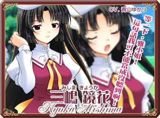 (三嶋 镜花(みしま きょうか), Mishima Kyōka)   声:青山ゆかり   自尊很高充满活力,性格有些尖锐的大小姐。   因为双方个性上的问题,经常会跟雅起冲突。   凹凸有致的窈窕身材,是她与雅的间隙加深的原因。   由於出身於传统世家,接受著严格的礼仪作法训练,   因此很自然会尊敬长辈,对於身为教师的司总是很有礼貌。   本校系的宿舍长,个性端庄,但却容易与理事长起冲突。