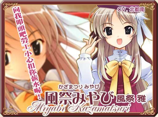 (5月3日)   (风祭 みやび(かざまつり みやび), Kazamatsuri Miyabi)    声:北都南   “凰华女学园分校”代理理事长,同时也是该校的一名学生。   个性蛮横,在执行理事长职务时,常与他人发生争执,经常竖起中指。   单纯、性急又草率的三冠王。出身于创立学院的风祭家。   虽然言行看来任性,本人却是拼命要完成理事长代理的职务。   擅长把自己伪装起来,并且表现出非常优雅的样子,不过只要面对一点小问题马上就会泄了底。   由於想要回应家族的期待,有点执著於规则的遵守。