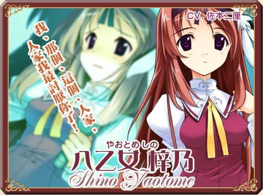 (6月21日)   (八乙女 梓乃(やおとめ しの), Yaotome Shino)   声:佐本二厘   个性内向,温柔贤淑的女性代表。然而却有极端的对人恐惧症。   总是惊慌地害怕著某些事情,躲在她唯一能敞开心房的殿子身后。   很少自己做决定,总是顺著其他人的意见。   也因此害怕周围出现急遽的改变,希望能封闭於安稳的现状。   另外因为会怯场,因此做事非常笨拙总是会犯些奇妙的错。   有“对人恐惧症”。目前是“校史编纂委员会”的成员。