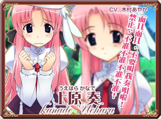(uehara kanade)    声:木村あやか   和平主义者,个性相当悠闲。   相对的容易钻牛角尖,缺乏临机应变的能力,   非常容易陷入混乱状态。   因为这样的个性,使得她在学院里头交不到朋友遭到孤立,   不过自从某次被学姐们嘲笑的时候被美绮搭救之后,就和她成为了好朋友。   虽然经常被美绮拖著跑,有时却也觉得自己要成为她的缓冲而燃烧起责任感。   对晓光一郎用情很深,最后有情人终成眷属.   非常可爱也不可或缺的配角,让无数人发出了“为什么不能攻略她,就算为此和晓翻脸也在所不惜啊”的感叹。
