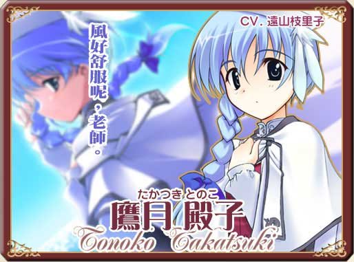 (6月7日)   (鹰月 殿子(たかつき とのこ), Takatsuki Tonoko)   声:远山枝里子   崇尚自由,个性成熟。八乙女 梓乃的唯一好友。   个性非常成熟,是能够让失控的雅镇静下来,并且让她不会生气的少数人之一。   不会受到同一件事情所局限,自由并且大而化之的个性。   然而她的麻烦之处,就在於因为过於大而化之,很难理解她在想些什么,   而且因为过於不会受到局限,随时都会不晓得晃到哪里去。   经常有人目击到她站在学院南边的高台眺望大海。