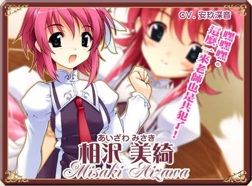 (4月24日)   (相沢 美绮(あいざわ みさき), Aizawa Misaki)   声:安玖深音   有著张非常适合她的纯真笑容,天真烂漫的元气女孩。   她这种开朗又自由奔放的样子,   给人一种跟世间所说的『大小姐』完全不同的印象。   虽然是个任凭好奇心随意行动的捣蛋鬼,不过因为对於任何人都平等以对,   很多本校系的学生也是她的朋友。自称是情报通,吹牛说自己熟知学院里的所有传闻。   凰华新闻的成员,个性活泼,与学校众人相处的不错。