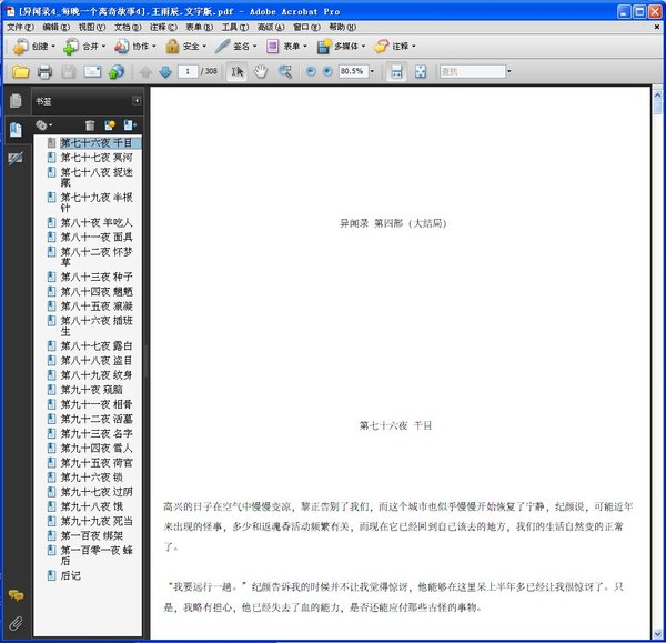 : 第七十六夜 千目 第七十七夜 冥河 第七十八夜 捉迷藏 第七十九夜 半根针 第八十夜 羊吃人 第八十一夜 面具 第八十二夜 怀梦草 第八十三夜 种子 第八十四夜 魍魉 第八十五夜 狼凝 第八十六夜 插班生 第八十七夜 露白 第八十八夜 盗目 第八十九夜 文身 第九十夜 窥脑 第九十一夜 相骨 第九十二夜 活墓 第九十三夜 名字 第九十四夜 雪人 第九十五夜 荷官 第九十六夜 锁 第九十七夜 过阴 第九十八夜 饿 第九十九夜 死当 第一百夜 绑架 第一百零一夜 蜂后 后记