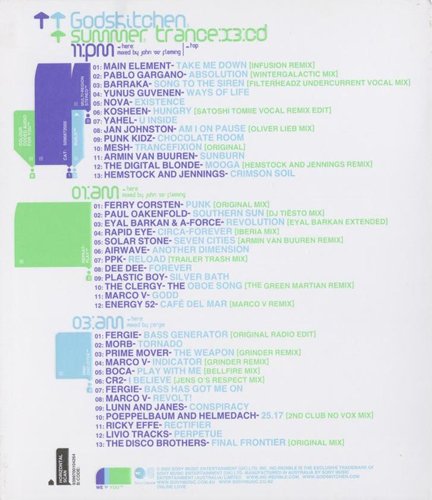 : CD 1 - 11PM 1.01. Main Element - Take Me Down (Infusion Remix) 1.02. Pablo Gargano - Absolution 1.03. Barraka - Song To The Siren (Filterheadz Undercurrent Vocal Mix) 1.04. Yunus Güvenen - Ways Of Life 1.05. Nova - Existence 1.06. Kosheen - Hungry (Satoshi Tomiie Vocal Remix Edit) 1.07. Yahel - U Inside 1.08. Jan Johnston - Am I On Pause (Oliver Lieb Remix) 1.09. Punk Kidz - Chocolate Room 1.10. Mesh - Trancefixion 1.11. Armin van Buuren - Sunburn 1.12. Digital Blonde, The - Mooga (Hemstock & Jennings Remix) 1.13. Hemstock & Jennings - Crimson Soil CD 2 - 01 AM 2.01. Ferry Corsten - Punk (Original Mix) 2.02. Oakenfold - Southern Sun (DJ Tiesto Remix) 2.03. Eyal Barkan & A Force - Revolution (Eyal Barkan Extended) 2.04. Rapid Eye - Circa-Forever (Iberia's Main Room Mix) 2.05. Solar Stone - Seven Cities (Armin van Buuren Remix) 2.06. Airwave - Another Dimension 2.07. PPK - Reload (Trailer Trash Remix) 2.08. Dee Dee - Forever 2.09. Plastic Boy - Silver Bath 2.10. The Clergy - Oboe Song (The Green Martian Remix) 2.11. Marco V - Godd 2.12. Energy 52 - Cafe Del Mar (Marco V Remix) CD 3 - 03 AM 3.01. Fergie - Bass Generator (Original Radio Edit) 3.02. Morb - Tornado 3.03. Prime Mover - The Weapon (Grinder Remix) 3.04. Marco V - Indicator (Grinder Remix) 3.05. Boca - Play With Me (Bellfire Mix) 3.06. CR2 - I Believe (Jens O's Respect Mix) 3.07. Fergie - Bass Has Got Me On 3.08. Marco V - Revolt 3.09. Lunn & Janes - Conspiracy 3.10. Poeppelbaum & Helmedach - 25.17 (2nd Club No Vox Mix) 3.11. Ricky Effe - Rectifier 3.12. Livio Tracks - Perpetue 3.13. Disco Brothers, The - Final Frontier