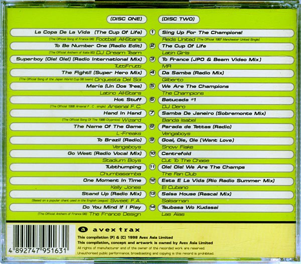 由日本 Avex Trax 制作的 Football 1998 合辑,网罗了世界各地不同球会的主题曲及打气歌曲,全新的编排版本,实行足球运动 Rave Party 总动员,也是每届世界杯球迷各种场合茶余饭后必听的火力强大的猛碟,惊骇不已的音效每每也令人心中余悸犹存。话说这张重型声音武器启动时,就象大球场万人狂欢、以迅雷不及掩耳的气势迎面炸射而来,场面壮观,假如没有领教过的人,可能就会被突然爆发的声音吓到,对于音响器材来说也必须格外谨慎,其具侵略性、破坏力的隐藏能量,很可能让您的宝贝喇叭开花,这可是无法索赔的。