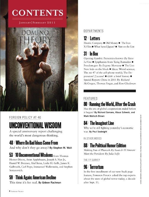 : 此杂志是在1970年由Samuel P. Huntington和Warren Demian Manshel在美国创刊的双月刊杂志。该杂志赢得了2009,2007和2003年美国卓越杂志奖,它的出版公司是华盛顿邮报公司,总部在纽约。其主题包括全球政治,经济一体化等思想。在2008年9月29日,华盛顿邮报公司宣布了对外交政策杂志的收购。2006年初,该杂志推出了博客。2009年1月5日,外交政策推出了一个雄心勃勃的目标:成为一个关心国际事务,有洞察力读者的每天必不可少的电子读物。 Foreign Policy is a bimonthly American magazine founded in 1970 by Samuel P. Huntington and Warren Demian Manshel. It is published by the Carnegie Endowment for International Peace in Washington, D.C., USA. Its topics include global politics, economics, integration and ideas. [官方网站] http://www.foreignpolicy.com/ Foreign Policy_January-February 2011