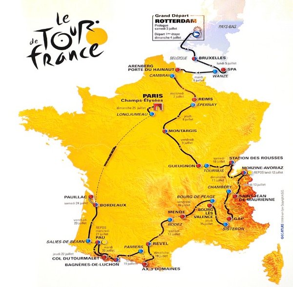 2010年第97届环法自行车赛将于7月3日至7月25日举行,今年的比赛将从荷兰鹿特丹出发,途径比利时和法国,终点仍然设在巴黎香榭丽舍大道,全程长3642公里。
