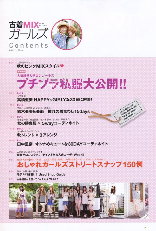 《古着mixガールズ》日本少女复古风杂志,年代久远的款式和面料,通过新潮的搭配,重新展现出与众不同的时尚魅力,复古风潮再次来袭! 古着,日文称“ふるぎ” 英文: old clothes、secondhand clothing,由日本流行而来,指在二手市场淘来的顶级服装品牌(如nike、adidas)的经典款式,在年轻人当中较为流行。 一般看不懂的人会问这又大又重又旧的谁会穿?其实是因为当时的牛仔要长期在野外工作,天气条件又很恶劣,从等影视作品里也能略知一二,所以这种衣服是当时的牛仔穿在外套外面保护里面的衣服以及御寒用的,是非常实用的功能性服装,属于工衣的一种,和现在作为潮流穿着的合身款式完全不同,这些服装流传到今天都是很不容易的,非常稀少,所以价格不低,懂的人也不多,只有两种人会买.   一种是喜欢怀旧的纯古着迷,他们穿的是当时的感觉和文化,这种人比较少,但都是比较疯狂的fans,他们知道好东西买一件少一件,所以他们卖去的衣服都藏起来,不拿出来流通的.还有一种就是现在国外炒了许多年,渐渐有着主流趋势的的古着MIX风,其实就是超级混搭的概念,对造型有着极度要求的特别潮人们(以艺术工作者居多)早已不满足于用现在市面上人人都能买到的新东西和来做搭配,他们要的是只属于自己的风格,那数量稀少,款式又特别的古着自然就是最佳的选择, 从杂志和网络等相关媒体上找出到相当多的样板来。