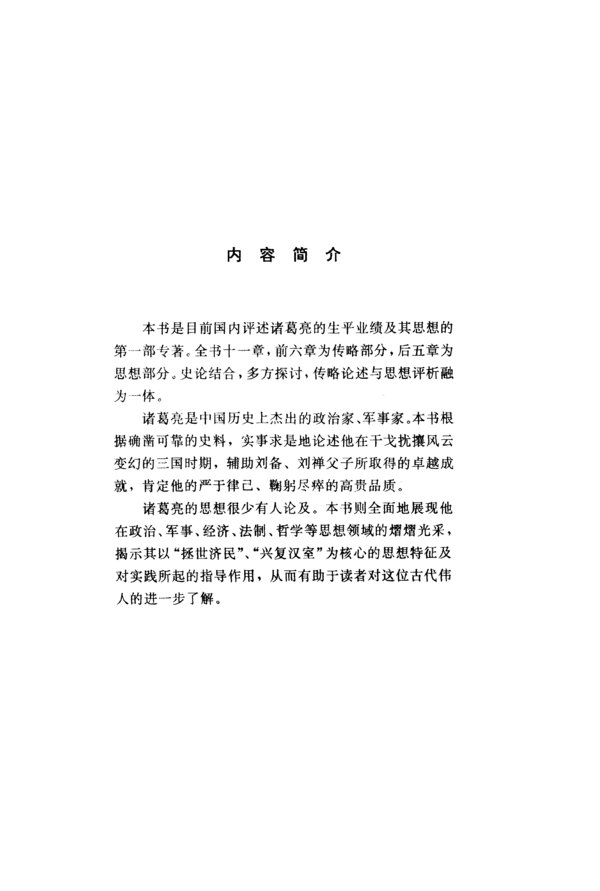 本书是目前国内评述诸葛亮的生平业绩及其思想的第一部专著。全书十一章,前六章为传略部分,后五章为思想部分。史论结合,多方探讨,传略论述与思想评析融为一体。