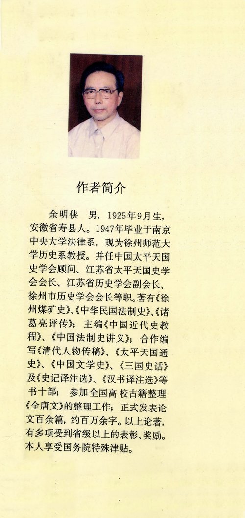 余明侠,男,1925年9月生,安徽省寿县人。1947年毕业于南京中央大学法律系,现为徐州师范大学历史系教授。并任中国太平天国史学会顾问、江苏省太平天国史学会会长、江苏省历史学会副会长、徐州市历史学会会长等职。著有《徐州煤矿史》、《中华民国法制史》、《诸葛亮传》;主编《中国近代史教程》、《中国法制史讲义》;合作编写《清代人物传稿》、《太平天国通史》、《中国文学史》、《三国史话》及《史记译注选》、《汉书译注选》等书十部;参加全国高校古籍整理《全唐文》的整理工作;正式发表论文百余篇,约百万余字。以上论著,有多项受到省级以上的表彰、奖励。本人享受国务院特殊津贴。