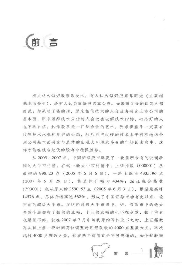 内容简介 本书以前所未有的视野、与众不同的思路带您游弋于各类庄股之间,生动地再现了大牛市行情的壮观场面及精彩纷呈的个股表现。分别从总体趋势、个体趋势、庄家特征、建仓时间、建仓力度、操作手法、操作力度、筹码分布、表现形式等方面来阐述各类庄家的投资偏好及各类庄股的习性特点、运作规律。任何股票的走势都会被您尽收眼底,任何庄家的行为都会被您了然于胸。您会真正了解技术分析的博大精深,您会真切地体会到“盘面走势说明一切”。