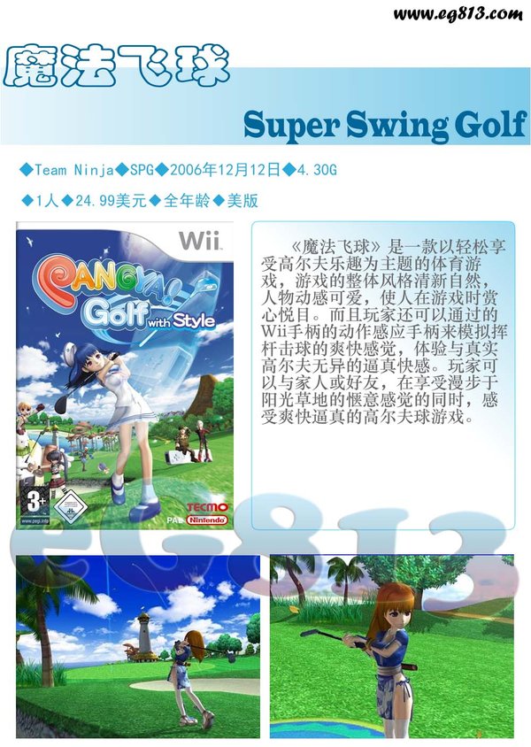 在PC上号称拥有700万用户的《SCAT Golf PANGYA》登陆Wii,并将成为Tecmo在任氏新天堂王朝中的首发软件!玩家不再是用自己的拇指进行游戏;不再是屏幕上生动有趣的角色的旁观者,一场革命在你我手中爆发!拿起控制器并且摇动它们吧!任天堂Wii控制器的应用引导游戏走向一个更高的层次。