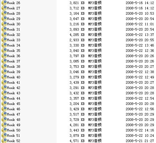 第1周 美食佳酿 第2周 酒水饮料 第3周 时尚购物 第4周 出行与交通 第5周 娱乐无限 第6周 游园漫步 第7周 外出旅行 第8周 生活醇香 第9周 追求时尚 第10周 休闲娱乐 第11周 生活的节拍 第12周 拥抱自然 第13周 E网情深 第14周 魔幻魅力 第15周 精彩足球Ⅰ 第16周 精彩足球Ⅱ 第17周 聚焦篮坛 第18周 乒乓球赛 第19周 网球赛事 第20周 奥运风情 第21周 莘莘学子 第22周 与爱相约 第23周 为爱痴狂 第24周 爱情柏拉图 第25周 人生路上 第26周 我爱我家 第27周 金色假期 第28周 上班族 第29周 “钱”途无量 第30周 出国留学 第31周 菁菁校园 第32周 初涉职场 第33周 有车一族 第34周 痴人说梦 第35周 关于工作Ⅰ 第36周 关于工作Ⅱ 第37周 生病就医 第38周 游戏空间 第39周 与友相伴 第40周 婚姻殿堂 第41周 宠物天地 第42周 网络知识 第43周 “网”事如烟 第44周 实用英语 第45周 节日情怀 第46周 闲情逸致 第47周 伟传统艺术 第48周 异域风情 第49周 聚光灯下 第50周 品味生活 第51周 瞭望台 第52周 宠爱自己
