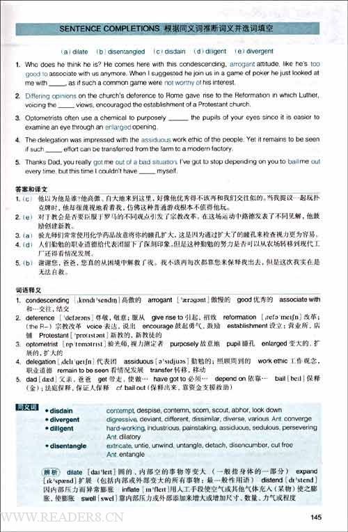 本书另一个引以为豪的特点是,它包含了2300多道练习题。首先,本书包含1000多道完句填空题(Sentence Completions)。此题型主要出现在英语考试词汇题和阅读理解题,以及GRE和SAT考试中。本书要求学习者根据以彩色标示的同义词来推出正确答案,为这种题型提供了集中训练的机会。这种练习对于提高阅读理解能力大有裨益,因为所有英语阅读理解短文中都反复使用同义词。其次,本书包含1000道同义词练习题和复习测试题。众所周知,大部分词汇题都是考查同义词的,这里不再赘述这些练习题的重要性。最后,本书包含300道实战模拟试题,可以作为对读者学习效果的最终检验。