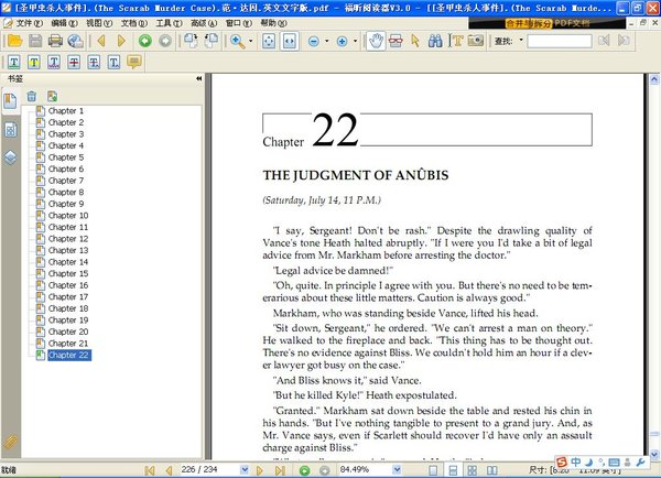 菲洛·万斯再次展现他的两大能力,博学与推理。埃及的神只与传说穿插在血淋淋的命案中;埃及人膜拜的复仇女神是破坏与毁灭的化身,尸体旁的圣甲虫却象征了复活和永生……