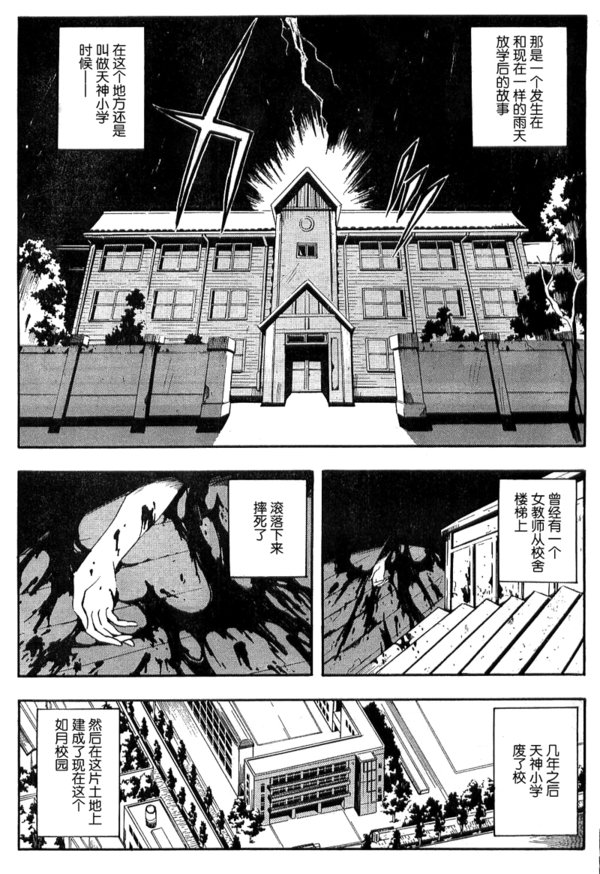 那是一个发生在和现在一样的雨天,放学后的故事。在这个地方还是叫做天神小学的时候。曾经有一个女教师从校舍楼梯上滚落下来摔死了。几年之后天神小学废了校,然后在这片土地上建立了现在的这个如月校园。新的校舍被重建后一直到现在,那个老师依旧在校舍中走动……晚上7点后还留在学校是很危险的…据说如果校舍碰巧因为停电而变得漆黑一片的话,那个老师就会出现……“还没回家吗?快点回家!!”