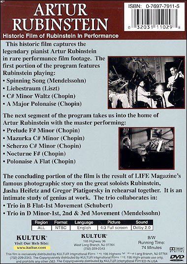This historic film captures the legendary pianist Artur Rubinstein in rare performance film footage. The first portion of the program features Rubinstein playing:
