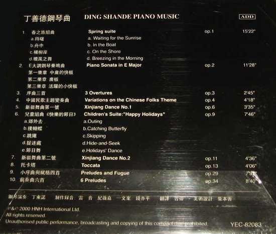 : 1.Spring Suite Op.1 春之旅组曲 2.Piano Sonata in E Major Op.2 E大调奏鸣曲 3.3 Overtures Op.3 序曲三首 4.Variations on the Chinese Folks Theme Op.4 中国民歌主题变奏曲 5.Xinjiang Dance No.1, Op.6 新疆舞曲第一号 6.Children's Suite Happy Holidays Op.9 儿童组曲 7.Xinjiang Dance No.2, Op.11 新疆舞曲第二号 8.Toccata Op.13 托卡塔 9.Preludes and Fugue Op.29 小序曲与赋格四首 10.6 Preludes Op.34 前奏曲六首