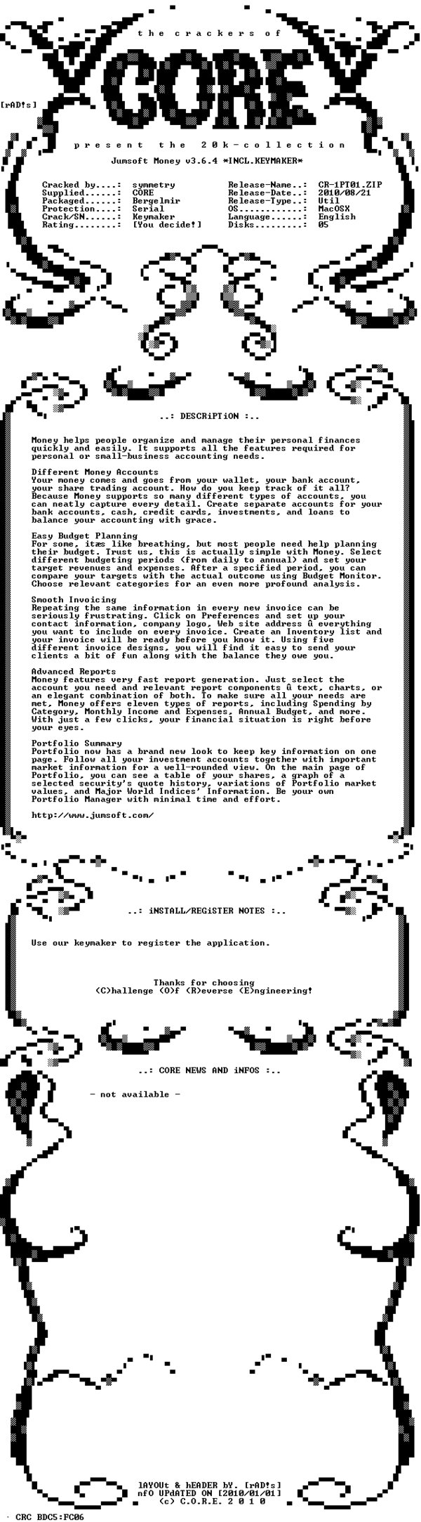 Jumsoft努力在打造一个即使用户不懂得会计的基础知识也能够有效地管理自己的财政软体。这种理念完全在Money上体现出来:简易的用户操作界面,内置帐户能智能化,有丰富的财务报告(如果你认真使用它的话),用户预算管理功能,并能在多帐户之间转移数据,分类管理帐户,支持OFX和QIF等文件类型等等的,这些功能应付一个小型的财政报表绰绰有余。