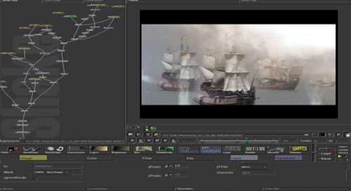 Apple shake教学中讲解了从3Dsmax中制作的场景以分层分通道的方式进行渲染.将背景.环境色.漫反色.阴影色.高光色.反射折射区.深度通道进行了分离独立渲染.并同过nuke合成软件对每一个通道进行识别.将不同的通道分开进行调节.以便于把三维制作的场景和实际拍摄的场景进行很好得色彩匹配和光源匹配.由于Shake软件通道的计算方面非常强大.众多的电影电视特效公司都用他来做一些高难度的特效合成.