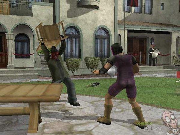 玩腻了在舞台上一层不变的摔角游戏了吗?还是嫌不够血腥暴力?那么这款「激斗摔角(Backyard Wrestling)」绝对符合玩家的胃口,虽然是摔角,但是暴力血腥的程度绝对让玩家无法想像,说这款游戏是格斗大作绝对不为过。