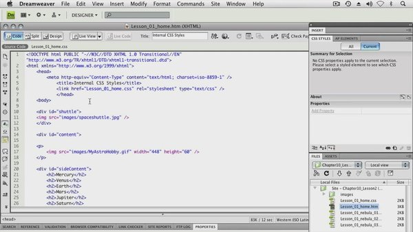 : 教程目录安排预览: Chapter 1: INTRODUCTION TO BUILDING A WEB PAGE (56 min) 1. What is HTML? 2. Setting Up the Text Editor to Create XHTML 3. Creating Your First HTML File 4. Adding Formatting Tags & Previewing in a Browser 5. Getting Started with Cascading Style Sheets 6. How Pages are Served Up 7. Choosing an Editor 8. Project Management Chapter 2: CREATING HTML DOCUMENTS (63 min) 1. Understanding Tags, Elements & Attributes 2. Defining the Basic Structure with HTML, HEAD & BODY 3. Assigning a Title & Using Paragraphs 4. Using Heading Tags & Whitespace 5. Creating Unordered & Ordered Lists 6. Fine-tuning Tags with Attributes 7. Adding Bold & Italics 8. Understanding How a Browser Reads HTML 9. Doc Types & Browsers Chapter 3: INTRODUCTION TO CSS (72 min) 1. What is CSS? 2. Internal Style Sheets, Selectors, Properties & Values 3. Building & Applying Class Selectors 4. Grouping Selectors 5. Creating Comments in Your Code 6. Using Div Tags & IDs to Format Layout 7. Understanding the Cascade & Avoiding Conflicts Chapter 4: ADDING IMAGES (43 min) 1. Image Formats & Production Considerations 2. Optimizing Images for the Web 3. Introducing the IMG Tag 4. Relative vs. Absolute URLs 5. Fine-Tuning with Alt, Width & Height Attributes Chapter 5: ANCHORS & HYPERLINKS (50 min) 1. Creating Hyperlinks to Outside Websites 2. Creating Hyperlinks Between Documents 3. Linking to Email Addresses 4. Linking to a Specific Part of a Webpage 5. Linking Images Chapter 6: MORE CSS TECHNIQUES (35 min) 1. Managing CSS with External Style Sheets 2. Setting Hyperlinks with Pseudo-Classes 3. The CSS Box Model: Padding, Borders & Margins 4. Styling Unordered & Ordered Lists with CSS 5. Overriding the Inheritance of Attributes Chapter 7: ORGANIZING INFORMATION WITH TABLES & DEFINITION LISTS (46 min) 1. Creating Tables & Table Attributes 2. Adding & Formatting Rows & Columns 3. Spanning Rows & Columns 4. Increasing Table Accessibility 5. Using Definition Lists to Organize Definition-Based Data 6. Using HTML Comments Chapter 8: CREATING LAYOUTS (61 min) 1. Adding a Side Content Div to Your Layout 2. Applying Absolute Positioning 3. Applying Relative Positioning 4. Using the Float & Clear Properties 5. Understanding Overflow 6. Creating Auto-Centering Content 7. Using Fixed Positioning Chapter 9: INTRODUCTION TO ADOBE?DREAMWEAVER? (39 min) 1. Getting Started with Dreamweaver & Setting Preferences 2. Creating a Local Site & Importing Files 3. Working in the Code, Design, & Split Views 4. Configuring FTP Options & Publishing Through Synchronization 5. Validating Your Code Chapter 10: WORKING WITH DREAMWEAVER (21 min) 1. Editing Style Sheets in the CSS Panel 2. Creating Description & Keyword Meta Tags 3. Using Dreamweaver to Preview in a Web Browser 4. Credits