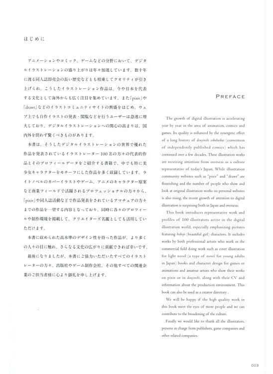 在「絵师100人 100 masters of Bishojo painting」中,不分艺术系还是萌系,集结了100位创作出具有设计性的优秀魅力作品的画师。100人之中既有在业界打拼多年、为轻小说画插图、为GALGAME做人设的职业画师们,也有通过pixiv、同人杂志等而为大家所熟知的业余画师,收录了约500幅作品。