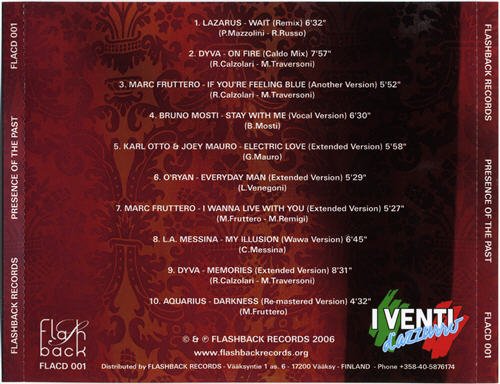 : 01. Lazarus - Wait (Remix) 6:36 02. Dyva - On Fire (Caldo Mix) 8:00 03. Marc Fruttero - If You're Feeling Blue (Another Version) 5:58 04. Bruno Mosti - Stay With Me (Vocal Version) 6:31 05. Karl Otto & Joey Mauro - Electric Love (Extended Version) 6:01 06. O'Ryan - Everyday Man (Extended Version) 5:31 07. Marc Fruttero - I Wanna Live With You (Extended Version) 5:31 08. L.A.Messina - My Illusion (Wawa Version) 6:45 09. Dyva - Memories (Extended Version) 8:32 10. Aquarius - Darkness (Re - Mastered Version)4:33