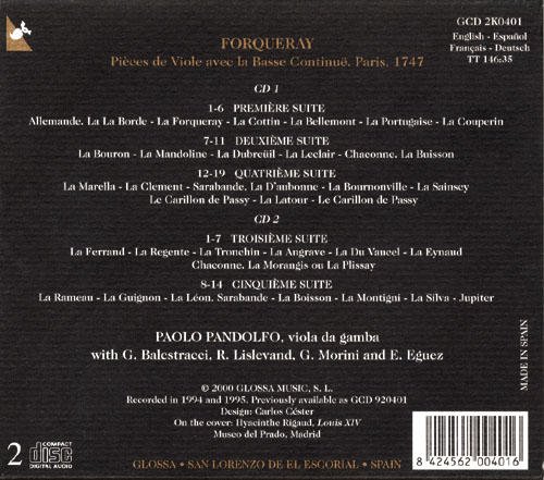 01. Suite for viol & continuo No.1: Allemande. La La Borde 02. Suite for viol & continuo No.1: La Forqueray 03. Suite for viol & continuo No.1: La Cottin 04. Suite for viol & continuo No.1: La Bellemont 05. Suite for viol & continuo No.1: La Portugaise 06. Suite for viol & continuo No.1: La Couperin 07. Suite for viol & continuo No.2 (Pieces de viole & continuo, Book 1): La Bouron 08. Suite for viol & continuo No.2 (Pieces de viole & continuo, Book 1): La Mandoline 09. Suite for viol & continuo No.2 (Pieces de viole & continuo, Book 1): La Dubreüil 10. Suite for viol & continuo No.2 (Pieces de viole & continuo, Book 1): La Leclair 11. Suite for viol & continuo No.2 (Pieces de viole & continuo, Book 1): Chaconne. La Buisson 12. Suite for viol & continuo No.4 (Pieces de viole & continuo, Book 1): La Marella 13. Suite for viol & continuo No.4 (Pieces de viole & continuo, Book 1): La Clement 14. Suite for viol & continuo No.4 (Pieces de viole & continuo, Book 1): Sarabande. La D'aubonne 15. Suite for viol & continuo No.4 (Pieces de viole & continuo, Book 1): La Bournonville 16. Suite for viol & continuo No.4 (Pieces de viole & continuo, Book 1): La Sainsey 17. Suite for viol & continuo No.4 (Pieces de viole & continuo, Book 1): Le Carillon de Passy 18. Suite for viol & continuo No.4 (Pieces de viole & continuo, Book 1): La Latour 19. Suite for viol & continuo No.4 (Pieces de viole & continuo, Book 1): Le Carillon de Passy