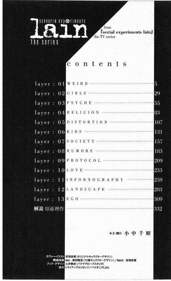 《玲音》(Serial Experiments Lain)是一部试验性动画,于1998年7月6日至9月28日在东京电视台的深夜时段播映,共13集。讲述了一个身处日本的14岁女孩岩仓玲音,以及如何受父亲影响,接触,进而发现了“连线”(Wired,一个国际性计算机网络)之中隐藏的巨大秘密,和自己的神秘身世的故事。原创编剧为小中千昭,原创角色形象设计为安倍吉俊,由岸田隆宏导演,production 2nd制作。在北美的制作发行公司为Geneon,在新加坡的制作发行公司为Odex。