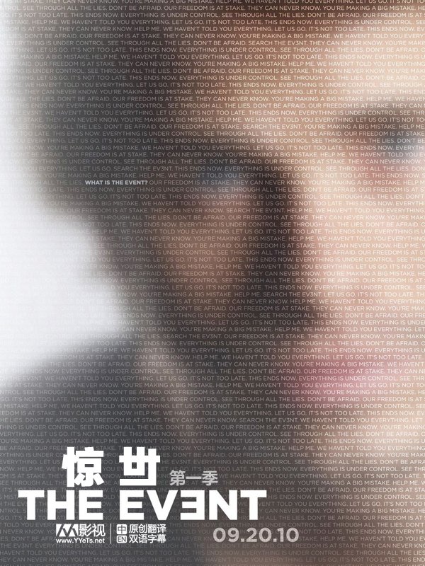 政治悬疑剧《惊世》(The Event)由创作过科幻悬疑剧《The 4400》的制片人NickWauters打造,来自《24》的制片人Evan Katz担任总监制。故事讲述普通人Sean Walker(JasonRitter扮演)在调查未婚妻Leila(SarahRoemer扮演)的神秘失踪事件时,卷入了一场巨大的政治阴谋,并揭开了美国历史上最大的秘密。Sean的一言一行、一举一动都将对一群看似毫无关联的人带来意想不到的影响,他们包括:刚刚当选美国总统的Martinez(Blair Underwood扮演)和第一夫人Christina(LisaVidal扮演);关押在阿拉斯加州一所秘密监狱里的政治犯Sophia(LauraInnes扮演),她同时是一个神秘集团的领袖;Sean的岳父(ScottPatterson扮演),他是个背景极其复杂的人;中央情报局局长Blake Sterling(ZeljkoIvanek扮演);与Sophia有关联的CIA特工Simon Lee(Ian Anthony Dale扮演)。