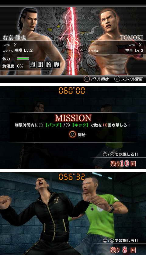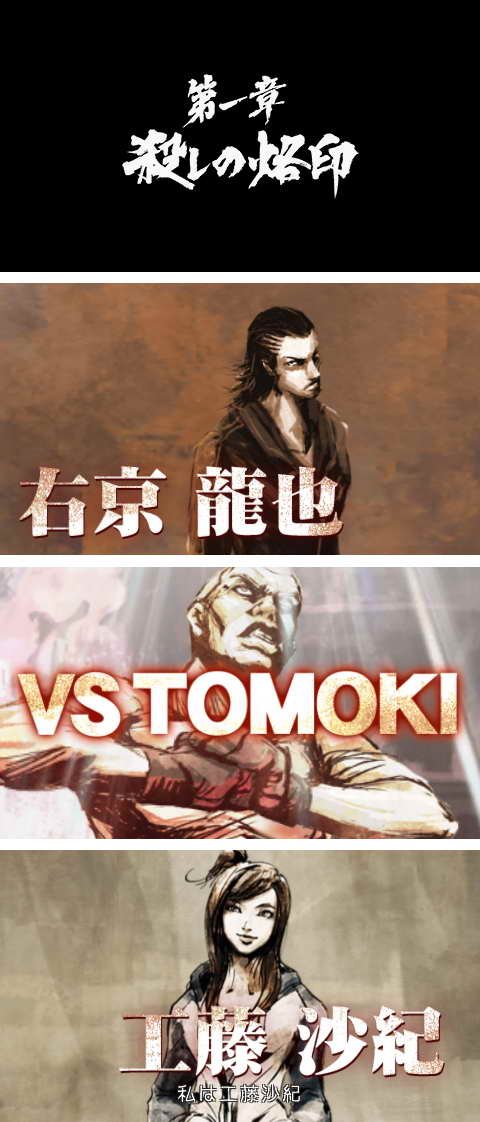 在每个章节的最后会有空手道、拳击这类格斗型态达到巅峰,而且无法用一般方式解决的斗士挡在龙也面前。只要在头目战时获胜,这个章节就算是通过,而且还会进入下一章。请利用街上的不良份子来磨练自己的格斗型态,并在和强敌战斗时获得胜利吧。而这次一开始挡在龙也面前的头目是拥有“空手道界怪物”别名的空手道家TOMOKI。他是个擅长踢技、直拳等肉搏技艺的斗士。