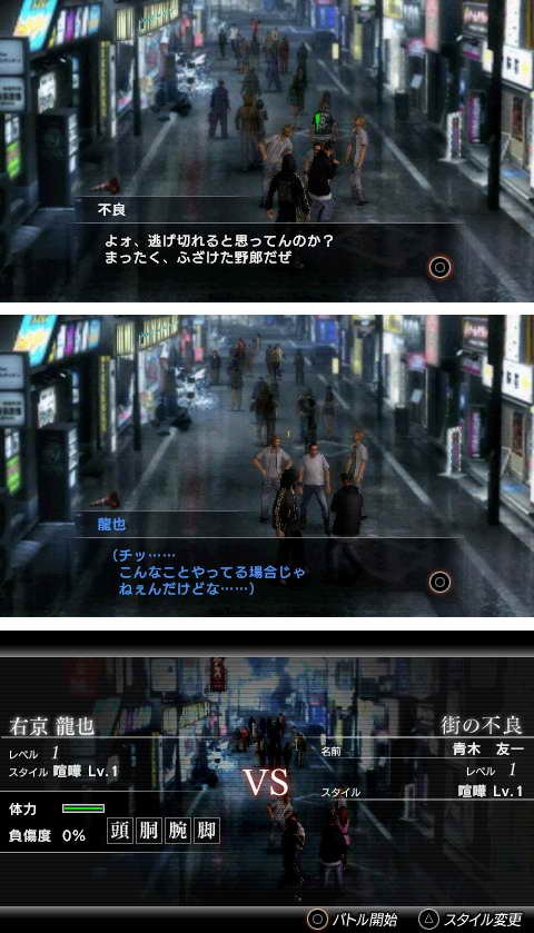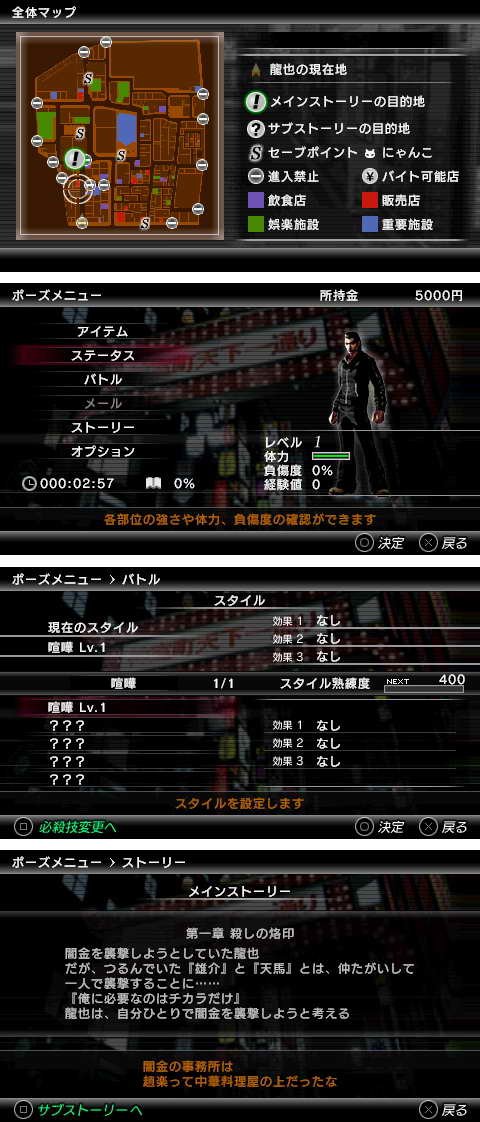 本作故事是由复数章节所构成,在每个章节里面都会有“探索神室町”的冒险部分。只要通过和本篇故事有关的事件就能让故事发展下去。在街上也会跟找碴的对手发生遭遇战。