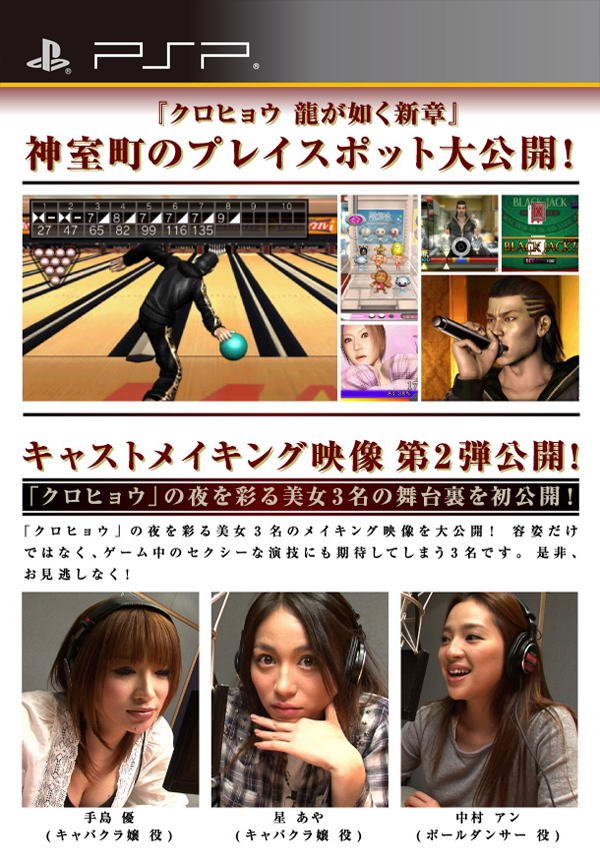 另外,此次还将公开人气泳装偶像、模特儿将以实名登场的消息。每一位都是能够让玩家深深着迷的美女。手岛优与星彩在本作中所演出的角色是夜店小姐。而中村安则是钢管舞女。不仅在声音方面,还会看到使用最新技术制作而成的3DCG角色也会在游戏中登场。在这里就要为大家送上这些演出者还有游戏中角色的具体资料。