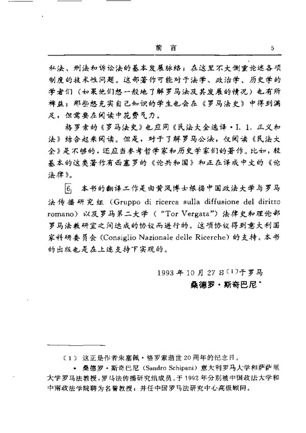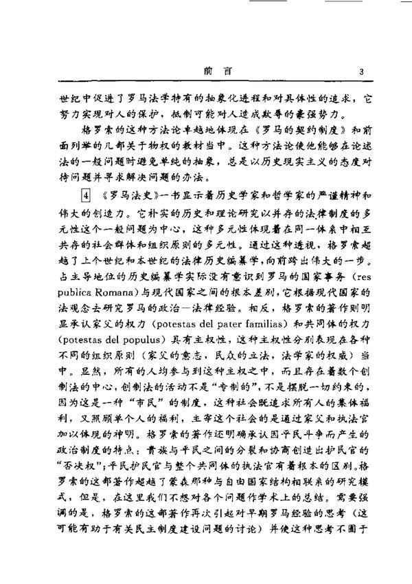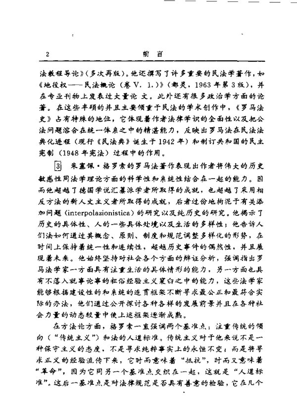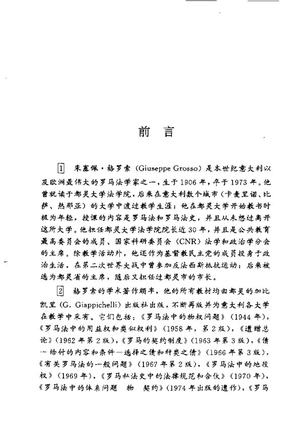 《罗马法史》显示着历史学家和哲学家的严谨精神和伟大的创造力。它朴实的历史和理论研究以并存的法律制度的多元性这个一般问题为中心,这种多元性体现着在同一体系中相互共存的社会群体和组织原则的多元性。通过这种透视,格罗索超越了上个世纪和本世纪的法律历史编纂学,向前跨出伟大的一步。占主导地位的历史编纂学实际没有意识到罗马的国家事务与现代国家之间的根本差别,它根据现代国家的法观念去研究罗马的政治一法律经验。相反,格罗索的著作则明显承认家父的权力(potestas del pater familias)和共同体的权力(potestas del populus)均具有主权性,这种主权性分别表现在各种不同的组织原则(家父的意志,民众的立法,法学家的权威)中。显然,所有的人均参与到这种主权之中,而且存在数个创制法的中心,创制法的活动不是“专制的”,不是摆脱一切约束的,因为这是一种“市民”的制度,这种社会既追求所有人的集体福利,又照顾单个人的福利,主宰这个社会的是通过家父和执法官加以体现的神明。格罗索的著作还明确承认因平民斗争而产生的政治制度的特点:贵族与平民之间的分裂和协商创造出护民官的“否决权”;平民护民官与整个共同体的执法官有着根本的区别。格罗索的这部著作超越了蒙森那种与自由国家结构相联系的研究模式,但是,在这里我们不想对各个问题作学术上的总结。需要强调的是,格罗索的这部著作再次引起对早期罗马经验的思考(这可能有助于有关民主制度建设问题的讨论)并使这种思考不囿于现代国家已有的经验。