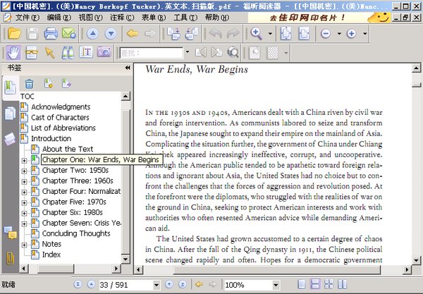 Nancy B. Tucker编著:《中国机密:美国外交官与中美关系(1945—1996)》是一部有关中美关系的文集,回顾了中美关系在上半个世纪的发展历程。其中涉及了许多重大的历史事件。这些文章使读者透过美国外交官和中国专家的眼睛,回想起在过去的五十年,中美关系是如何变化的:在上个世纪五六十年代,华盛顿视北京为其在东亚利益的主要威胁者;到了七十年代,美国领导人希望把与中国的合作作为牵制苏联的平衡力量;自八十年代后期尤其是苏东剧变之后,美国与中国的关系更加复杂。在促进与中国的贸易往来的同时,美国官方也一直在中国政府的“人权问题”上纠缠不休。人权成为两国争论的焦点。书中的文章对这些问题都进行了回顾,不仅分析了美国的态度和想法,而且也分析了中国的动机和考虑。本书可以丰富我们对美国外交决策过程的理解,从更深的角度来了解中美关系和相互影响。 近50年来的中美外交,历经对日抗战、大陆易帜、823砲战、大跃进、文化大革命、华沙会谈、尼克森访问中国、联合国中国席位争夺战乃至1996年台海飞弹危机等重大转折。「中美外交秘辛」所访谈的51位美国外交官,对这些转折都有一手的观察与说明。 论述中美外交关系的著作何止千百种,但以外交人员第一手经验和见解为主要内容,并经过学界专人编辑、整理、系统化呈现外交关系全貌的,本书当为第一本。